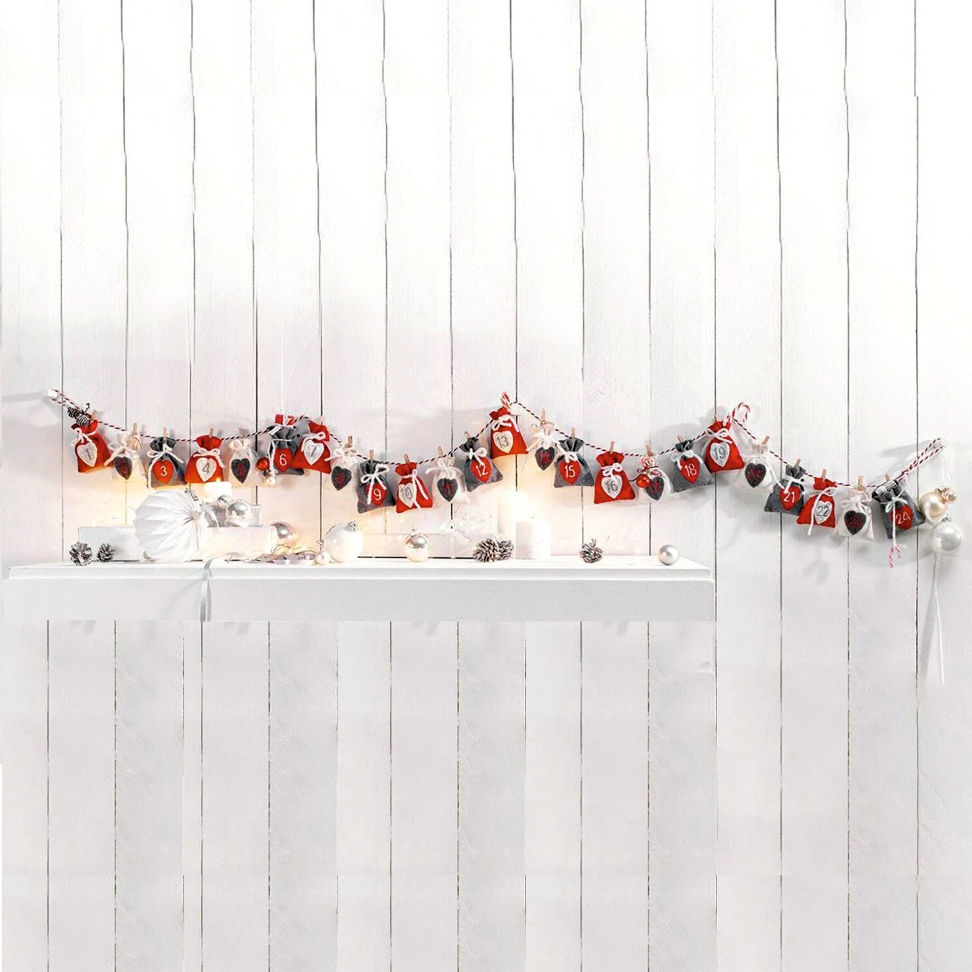 Includes 24 felt pouches in red, white, and grey with embroidered numbers