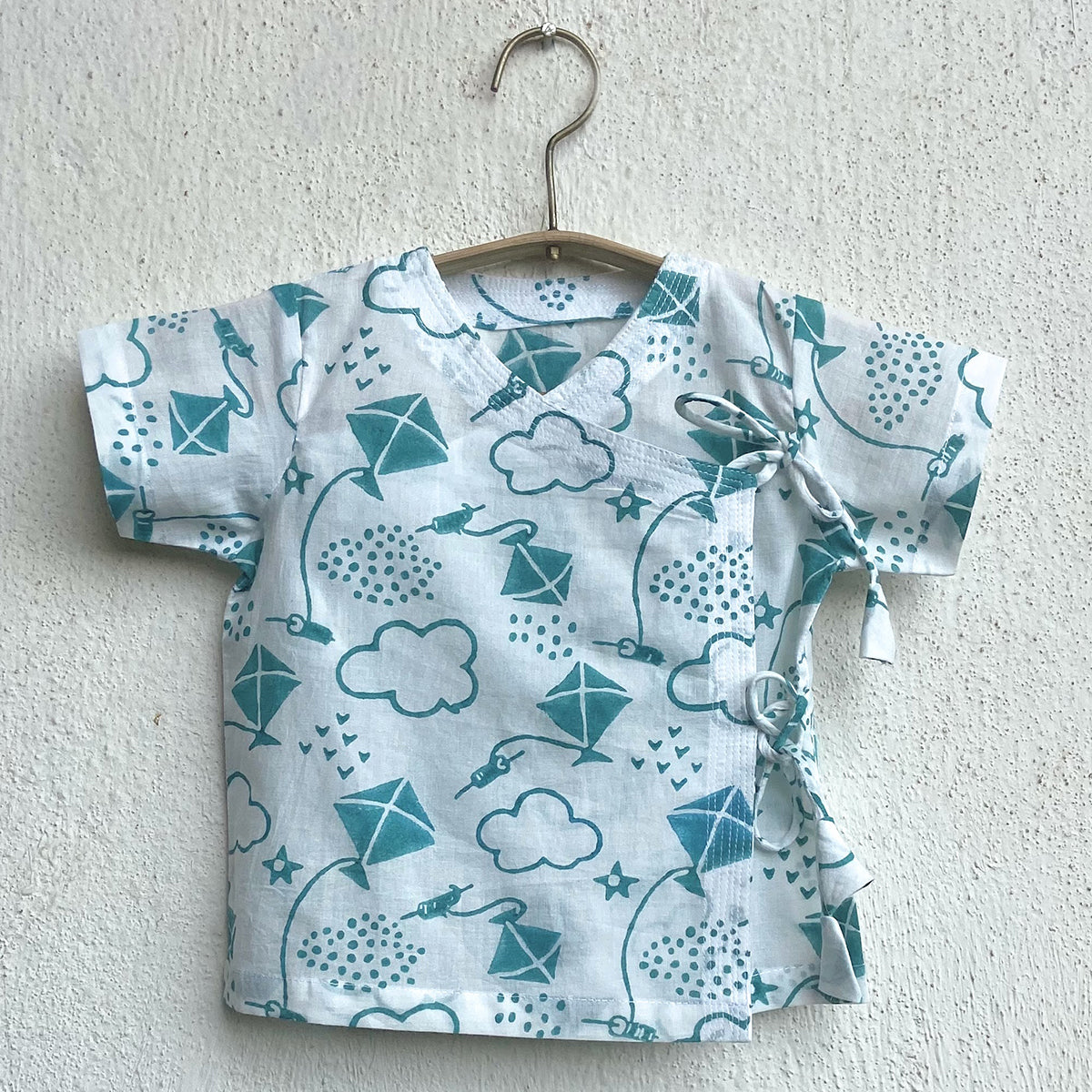 The Angarakha has tie-up closure for ease of wearing and fit and is hand-block printed with eco-friendly dyes. To know more about our making process, read here. The pyjamas have an elasticated waist and bottom hem and is dyed with azo-free mint colour. All-over hand block printed patang or kite design in the colour of sunshine. Design is inspired by an original poem titled ‘Little Koi wants to fly’. Because of its handmade nature, variations in printing and stitching are a part of its charm. We urge you to treasure its uniqueness.