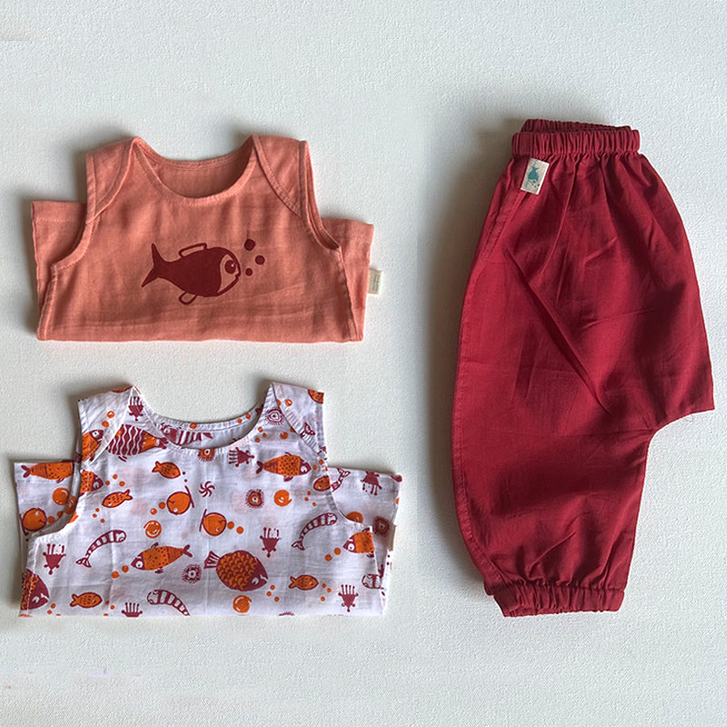 - 2 x jhabla tops 100% organic cotton sleeveless top with envelope neck for hassle-free wearing. All-over hand block printed fishes in orange is complemented with a placement printed peach top.