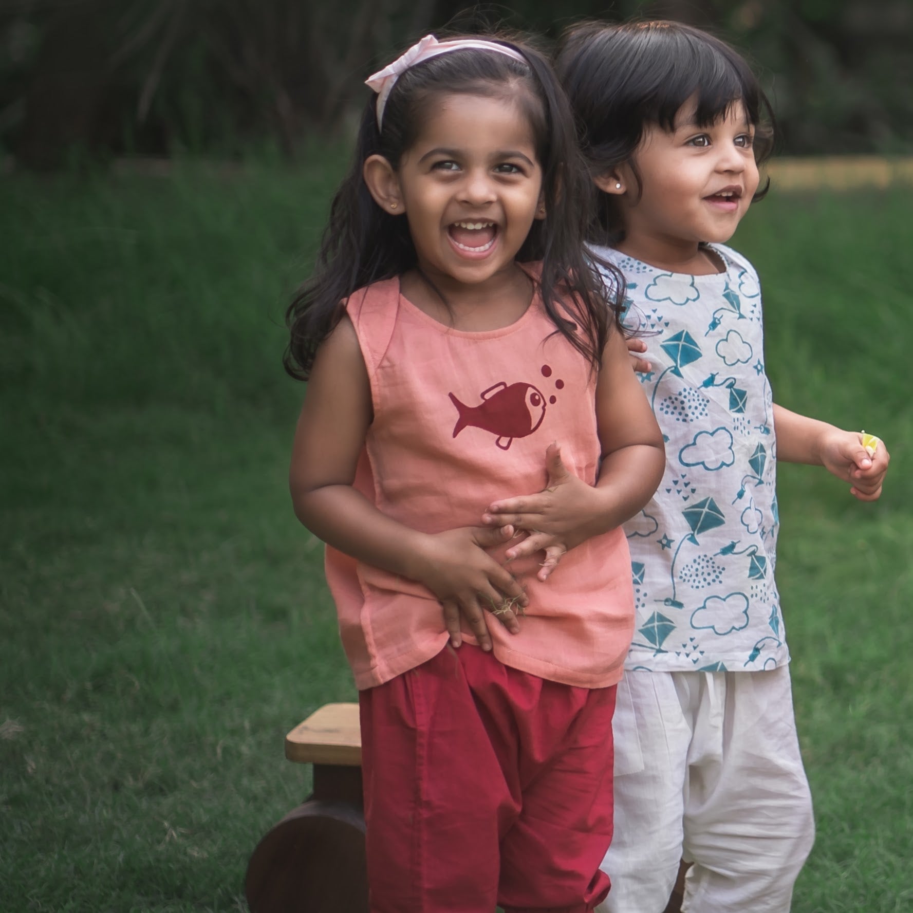 - 1 x jhabla top: 100% organic cotton sleeveless top with envelope neck for hassle-free wearing. Peach coloured with placemet printed fish in red.