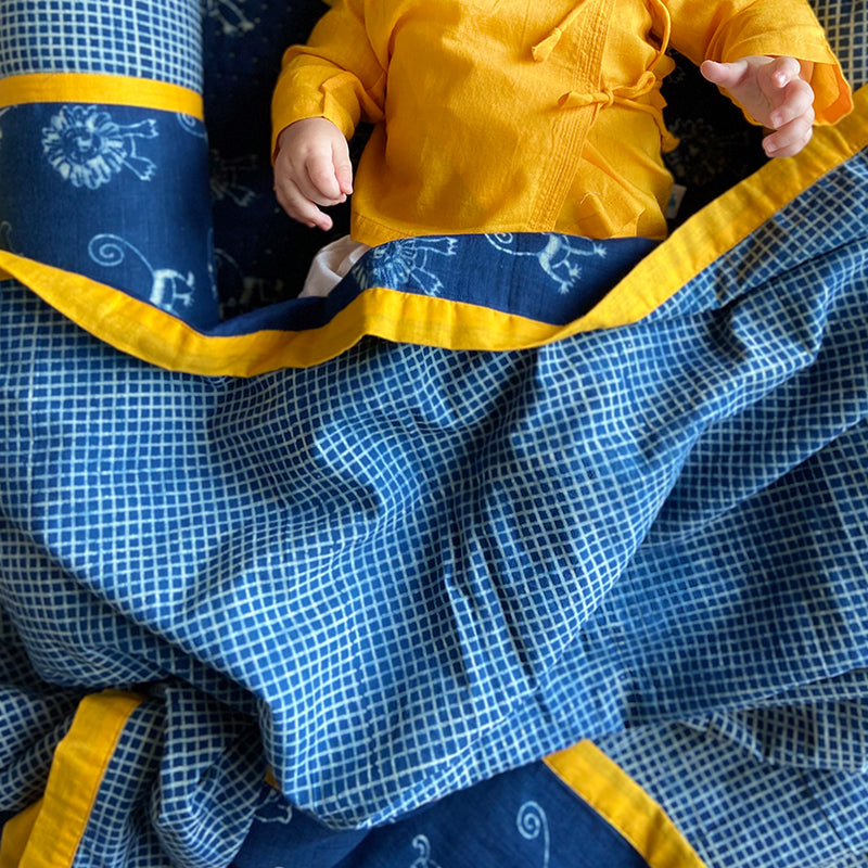 Our absurdly soft organic cotton 36“ x 50” dohar will grow with your munchkin. Perfect for outdoor or indoor use, the reversible dohar has printed animals on one side and checks pattern on the other. The motifs are hand-block printed and indigo dyed by traditional Ajrakh craftspeople in rural Gujarat. Part of our Zoo Treat poem collection. Designed and made in India.